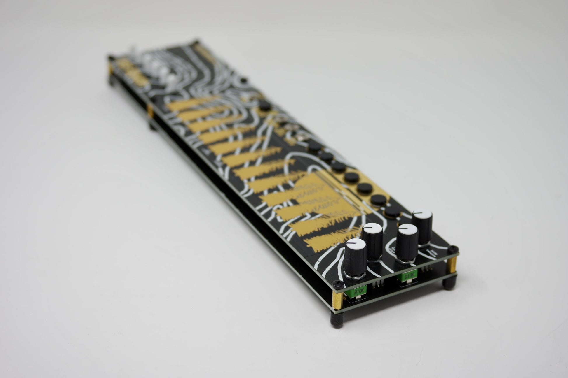 An all in one human interface, the copper touch plates output both note and pressure information, over both I2C (duophonically) and USB MIDI (fully polyphonically), the 8 buttons allow for mode-switching, event triggering and midi note drones, and the 4 knobs and 6 sliders add midi cc output and physical control over teletype variables, making Teletouch a natural centre of control in your system.